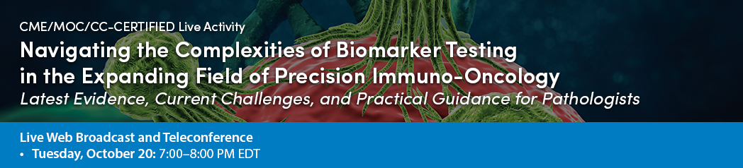 This live web broadcast of the PeerView Virtual Seminar and Workshop will provide participating pathology professionals with evidence-based and practical expert instruction on biomarker testing in the era of precision cancer immunotherapy. In the Seminar segments, our expert panel will review evidence on current and emerging immunotherapies and biomarkers, and the Workshop segments will focus on the nuances of applying this evidence to pathology practice, as well as strategies for collaborating with oncology professionals to interpret biomarker testing results when making clinical decisions for patients with cancer.